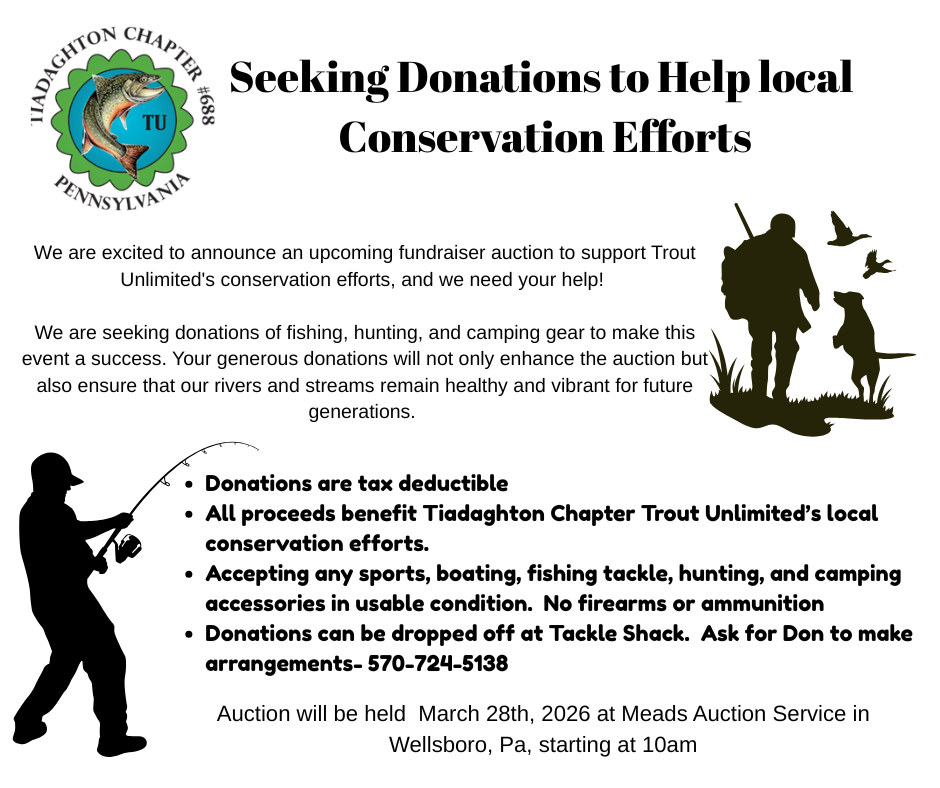 Trout Unlimited Tiadaghton Chapter #688 is seeking donations of fishing, hunting, and camping gear to make this event a success. Your generous donations will not only enhance the auction but also ensure that our rivers and streams remain healthy and vibrant for future generations.